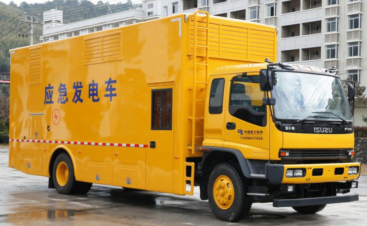 发电车主要由底盘车、车厢、操作间、机组、进排风系统、排烟系统、液压支撑系统、电缆固定及收放系统及附件组成,容量可达2400kVA。