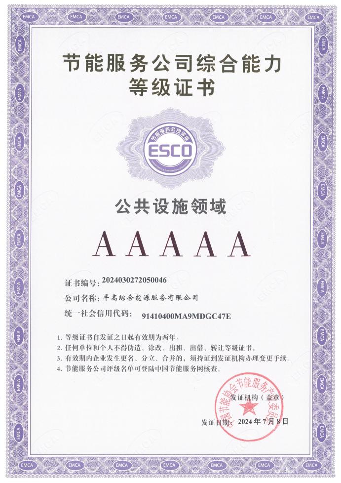 平高集团所属综合能源公司获节能服务公司综合能力“公共设施AAAAA”级认证