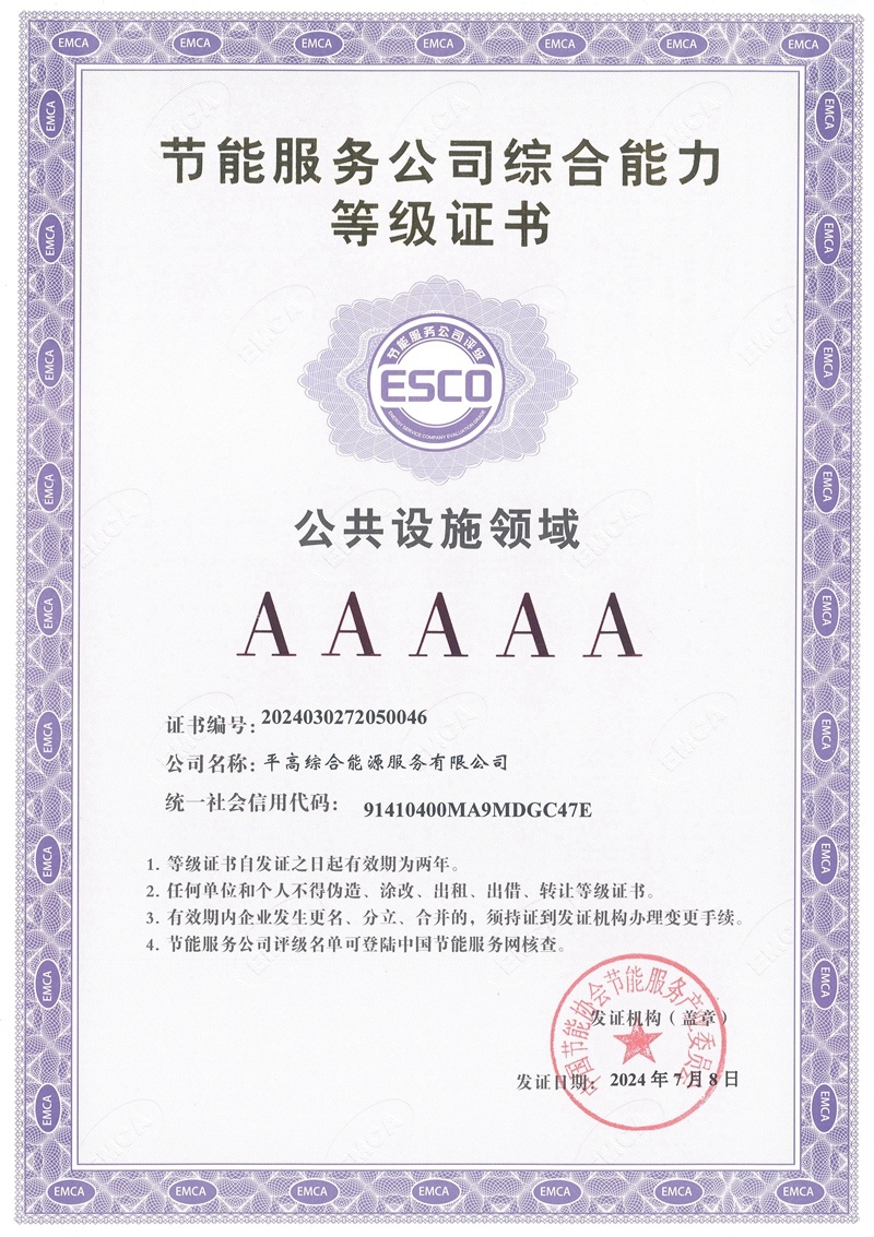 2024年7月15日,中国节能协会服务产业委员会公布了节能服务公司综合能力评定的结果,河南省平顶山市中国电气装备平高集团所属平高综合能源服务有限公司(以下简称“综合能源公司”)获得了节能服务公司综合能力“公共设施AAAAA”级认证证书。
