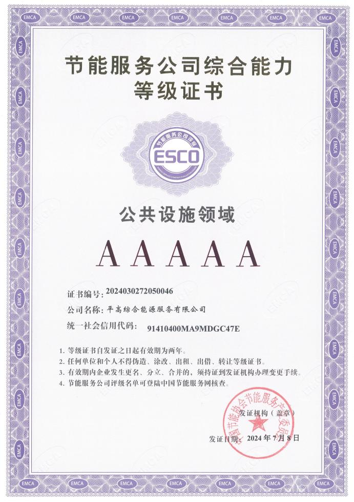 7月15日,中国节能协会服务产业委员会公布了节能服务公司综合能力评定的结果,平高集团所属平高综合能源服务有限公司(简称“综合能源公司”)获得了节能服务公司综合能力“公共设施AAAAA”级认证证书。